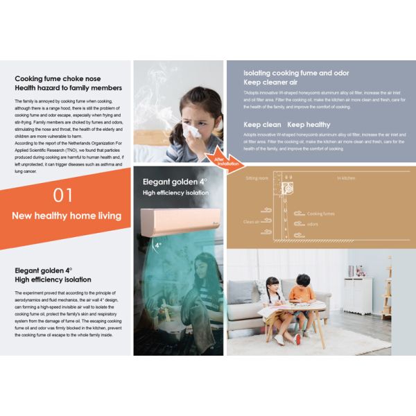 Cooking Fume Air Barrier, form an invisible air wall between the kitchen and the dining room, effectively avoid cooking fume and odor escape and invade the home, protect the elderly and children to avoid the damage of fume oil.